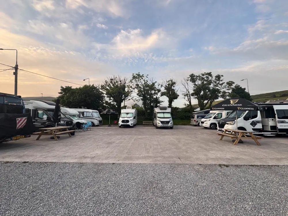 Un pub très récent à Dingle qui a eu la bonne idée de transformer son parking arrière en aire de camping-car, certes spartiate, mais en plein centre-ville. Le prix est toutefois bien trop cher pour les services proposés.