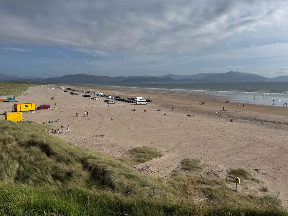 En chemin, arrêt, photo sur une immense plage de sable blanc, qui fait également office de vaste parking, c’est la première fois que nous voyons des voitures autorisées à se garer à même la plage. Il fait beau et il y a du monde à la plage !