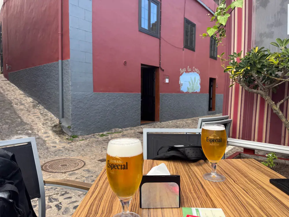 Nous rebroussons chemin et, juste avant le mirador, faisons une pause, chips, bière tout seul dans la nature au milieu de paysages vraiment très très beaux. Puis c’est la descente du canyon pour rejoindre le village d’Agulo.