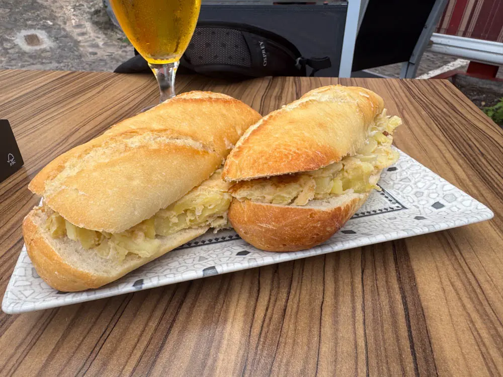 Nous déambulons dans les petites rues du village, c’est dimanche et tout est fermé, sauf un petit restaurant que nous trouvons un peu par hasard où nous nous attablons pour deux bières et deux sandwichs à la tortilla espagnole. En revenant au bord de la route principale, nous constatons toutefois qu’il y avait au moins deux autres options pour manger, dont un café proche de la route, entre autres.