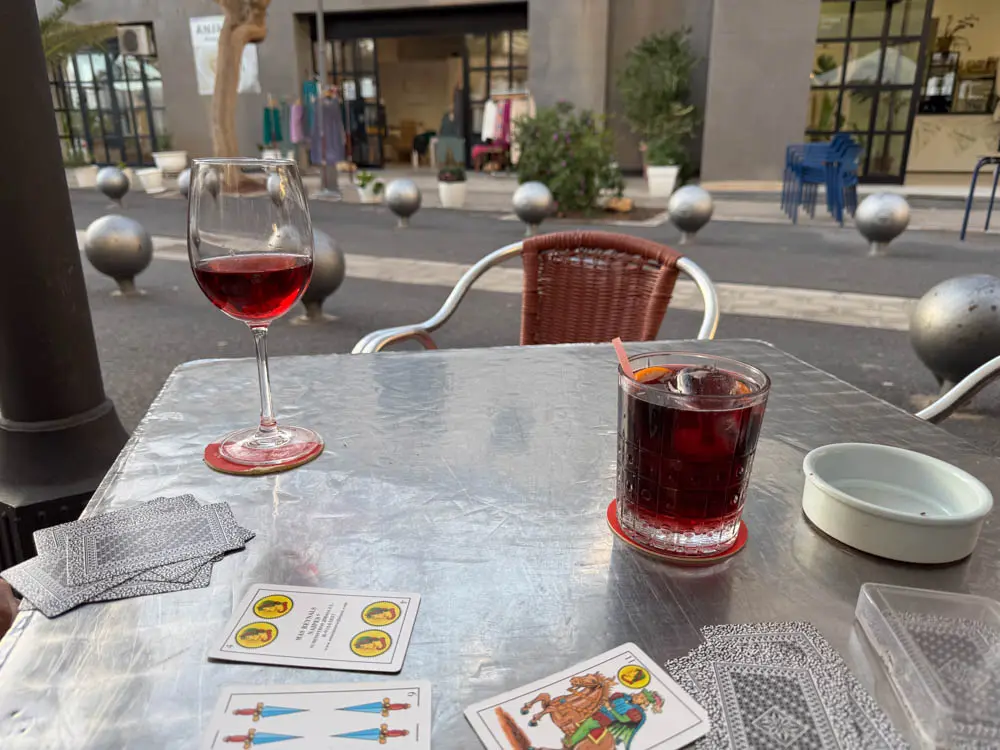 Nous revenons ensuite sur nos pas, et trouvons juste avant le coucher du soleil un petit bar pour prendre l’apéritif un peu en retrait de la rue principale, Tinto, de verano et rosé pas fou fou.