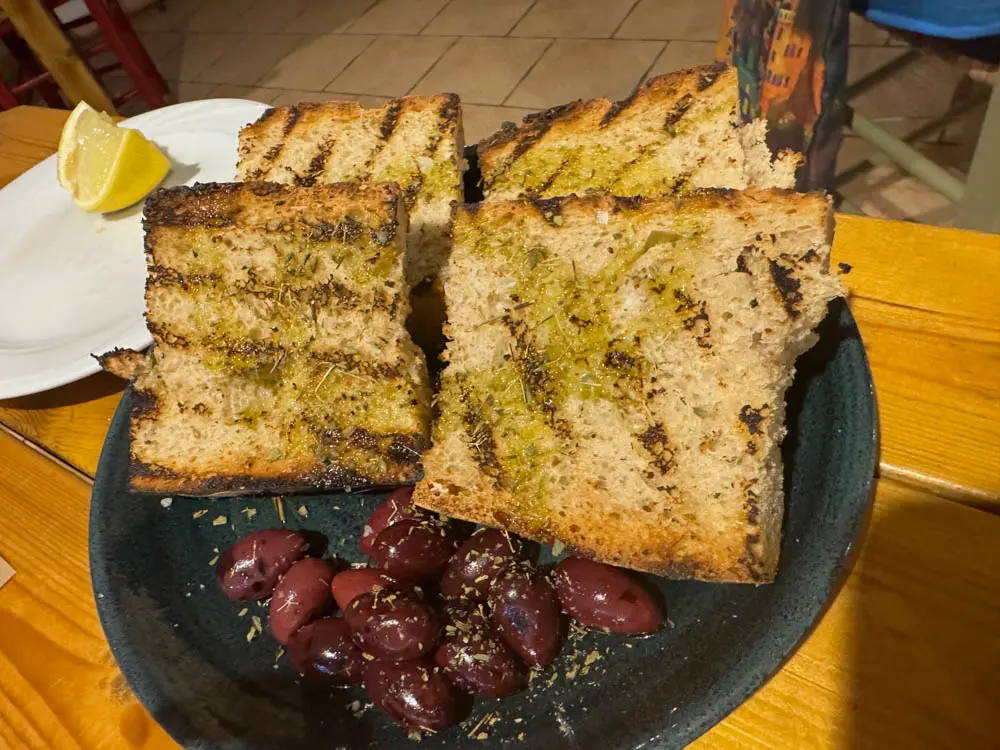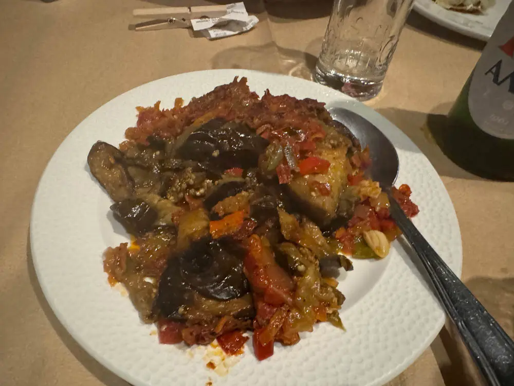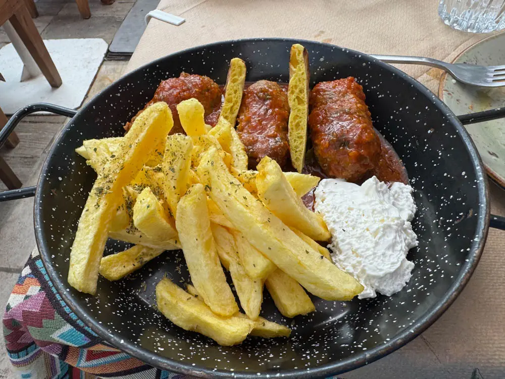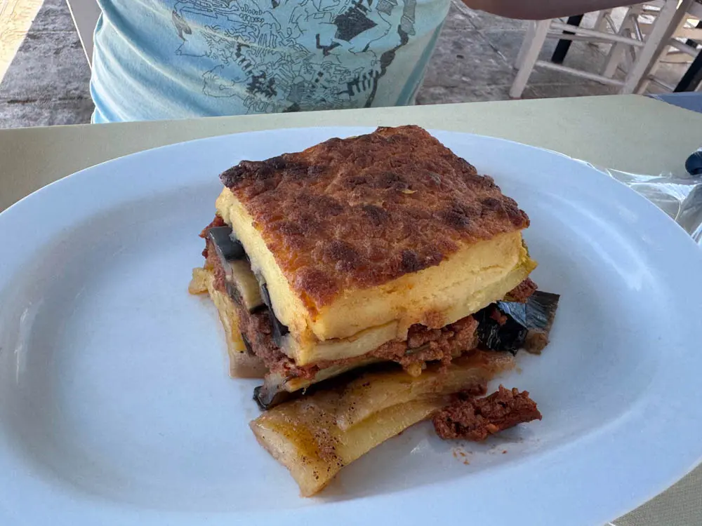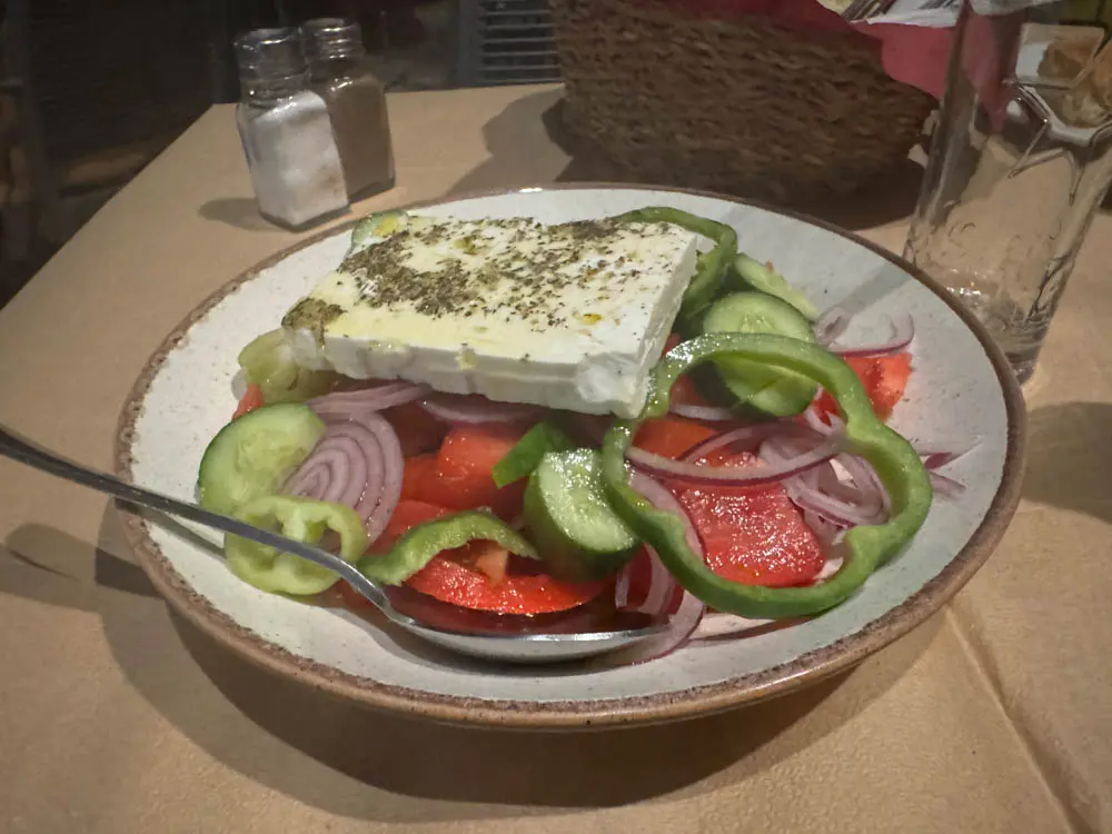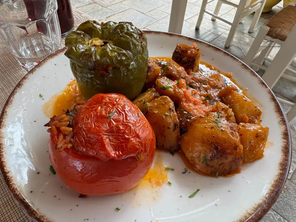 Un restaurant a priori touristique, belle terrasse ombragée dans les petites rues piétonnes de la ville, une bonne surprise gastronomique au final. Spécialités de soutzoukakia (boulettes de viande) et kleftiko (porc mariné et cuit au four)