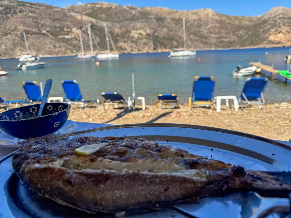 Une taverna intimiste et familiale au-dessus de la plage. Accueil charmant.